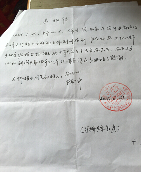2015年5月25日中午12點25分左右,在海寧農(nóng)商銀行馬橋支行柏士分理處上班的保安員徐永良在執(zhí)勤期間撿到一臺蘋果5S手機(jī),他主動交給柜臺組長,并及時聯(lián)系到了失主,失主在當(dāng)天12點35就來到網(wǎng)點取回手機(jī),并對徐永良的拾金不昧表示了感謝。