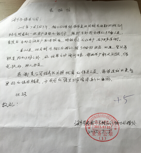 農(nóng)商銀行馬橋分理處保安收到表揚(yáng)信