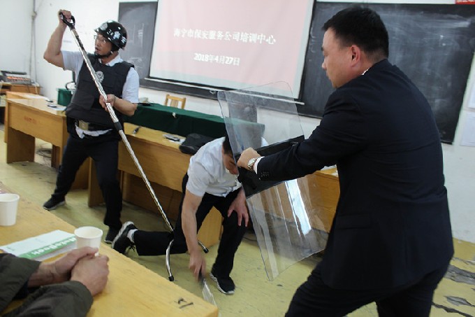 顧振宇教員針對(duì)反恐工作,仔細(xì)地介紹了反恐8件套的使用方法,協(xié)同其他教員向在座的保安員示范正確的操作方法,現(xiàn)場(chǎng)進(jìn)行了反恐演練,讓新保安員們對(duì)此有了更直觀的了解。
