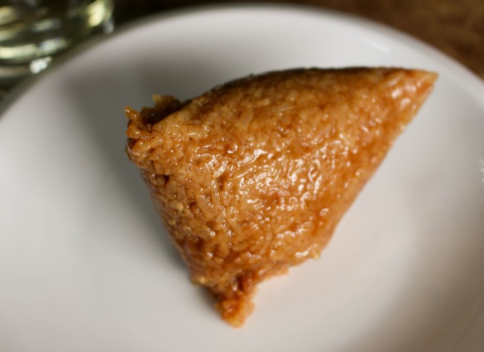 用翠綠的箬葉包裹著醬色的糯米和新鮮的豬肉