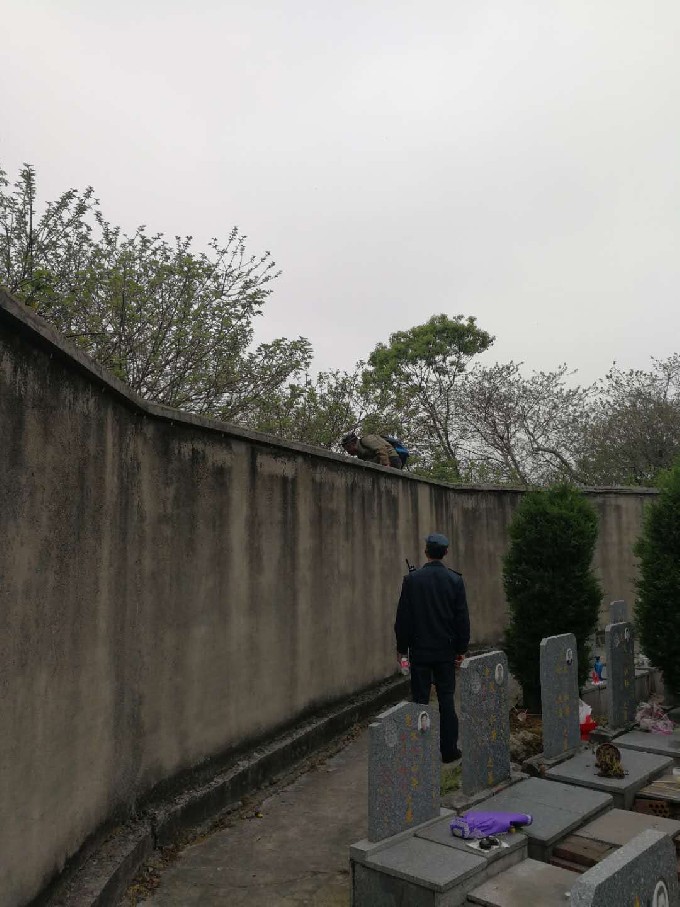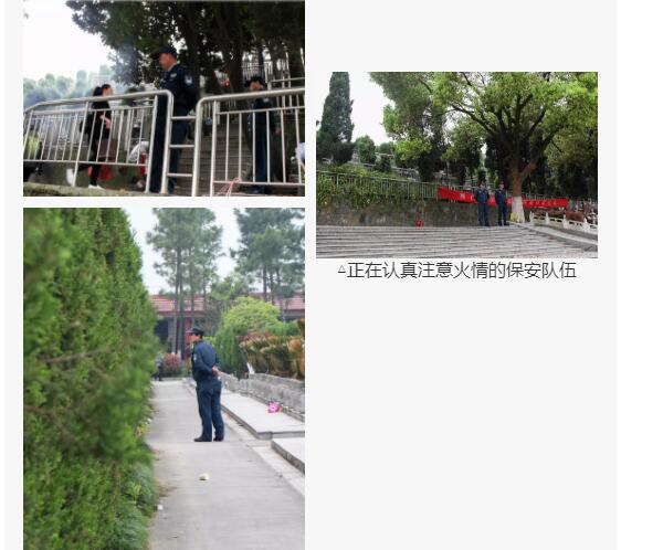 為避免因群眾燃燒冥幣、吸煙引起火災(zāi)等事故,我們還加強(qiáng)了保安力量,在祭拜區(qū)設(shè)立站崗,密切注意,提醒群眾,及時(shí)制止危險(xiǎn)行為。一旦出現(xiàn)火情,我們的保安都要做到快速出動,及時(shí)處理,確保無消防安全事故。 在幾個(gè)經(jīng)常發(fā)生外來人員翻越山頭圍墻進(jìn)入墓區(qū)偷盜供品的入口,也安排了保安員檢查。這期間,我們的保安員制止了多起這樣的行為,獲得了市民的認(rèn)可。