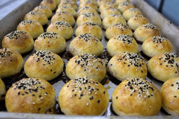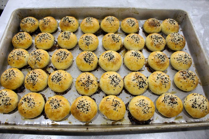 這兩天,安保超市正在制作土豬肉月餅了哦~小編專門去給大家探探風(fēng),畢竟對(duì)于大家來(lái)說(shuō):吃得放心最重要! 肉餡便是當(dāng)天新鮮的土豬肉,肥瘦有間。放入鮮蔥和醬料,大力攪拌,肉餡備用。咱們做月餅的阿姨一看就是“練”過(guò)的,做面皮也是麻溜得很!制作面皮的豬油,用的還是自己熬的土豬肉油,白花花的像雪糕似的。 包月餅咯~像這樣的傳統(tǒng)月餅,都是手工包出來(lái)的。肉餡的個(gè)頭那真是大,不是來(lái)虛的哦~!手法嫻熟,個(gè)頭均勻~看著速度碼完的烤盤,特別滿足!最后,刷上蛋液、撒上芝麻,一盤盤精心制作的土豬肉月餅就上烤爐了。等待之中,香味四溢,口水“嗒嗒滴”~