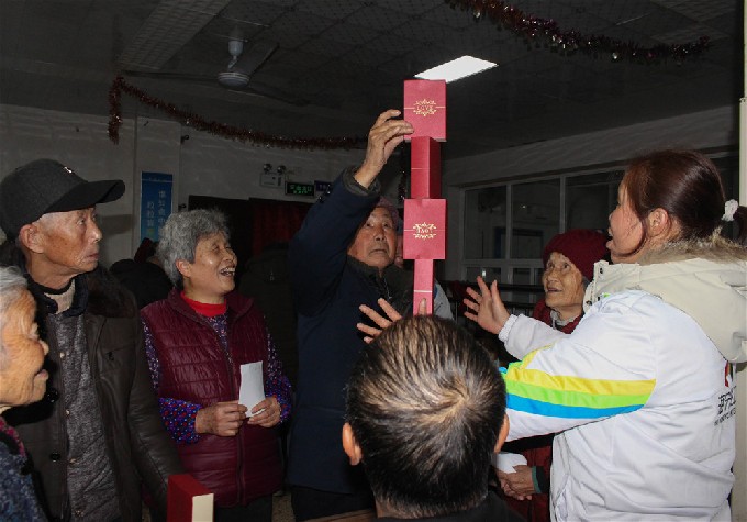 原來(lái),為了讓老人們“老有所樂(lè)”,活動(dòng)筋骨又活躍節(jié)日氣氛,海寧義工和海寧保安志愿者精心準(zhǔn)備了甩骰子、夾彈子、拼圖、猜字謎、折紙、疊高這幾個(gè)小游戲,供老人們娛樂(lè)。
