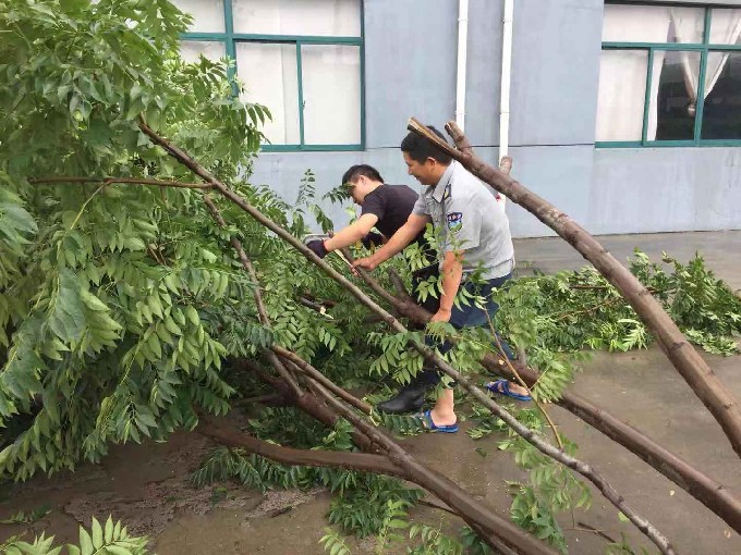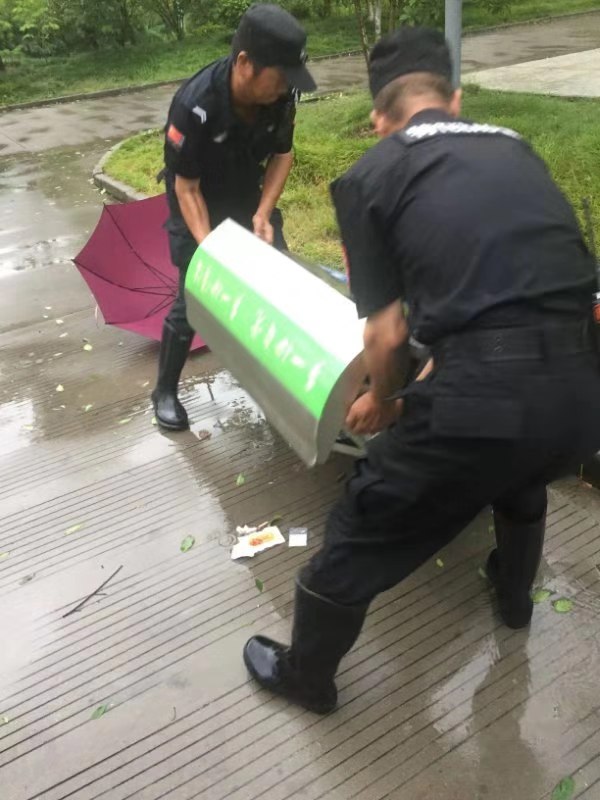 面對因大風大雨帶來的損壞,如樹木、垃圾桶等倒伏情況,保安員們都迅速協(xié)助各客戶單位將障礙物清除,對將被吹倒的大樹冒雨采取鞏固措施,以防傷人或阻礙交通。