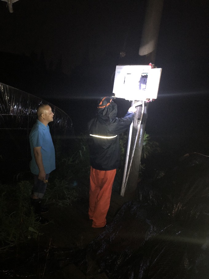 為防止雨水大量淹沒莊稼作物,安保生態(tài)農(nóng)業(yè)基地人員連夜用泵抽水,大風造成斷電的情況下,及時報修供電部門,連夜修復。
