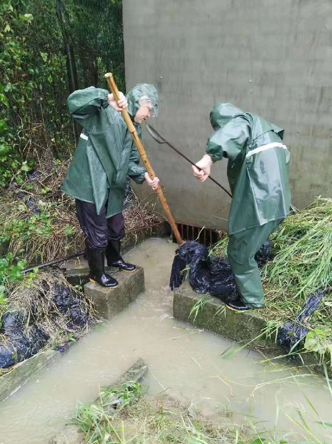 另外,基地排水溝渠縱橫眾多,工作人員冒著雨協(xié)力將基地各溝渠清理,以保證排水順暢。