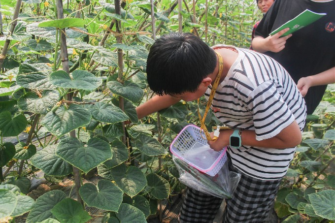 跟隨基地工作人員的腳步,同學(xué)們有序地參觀了正當(dāng)季的黃瓜和地蒲大棚,還親身體驗(yàn)了一把摘黃瓜的勞作樂趣。參觀期間,農(nóng)民伯伯親切地向同學(xué)們介紹了大棚蔬菜,解答同學(xué)們提出的各種問題,寓教于樂,形成了良好的互動(dòng)氛圍。